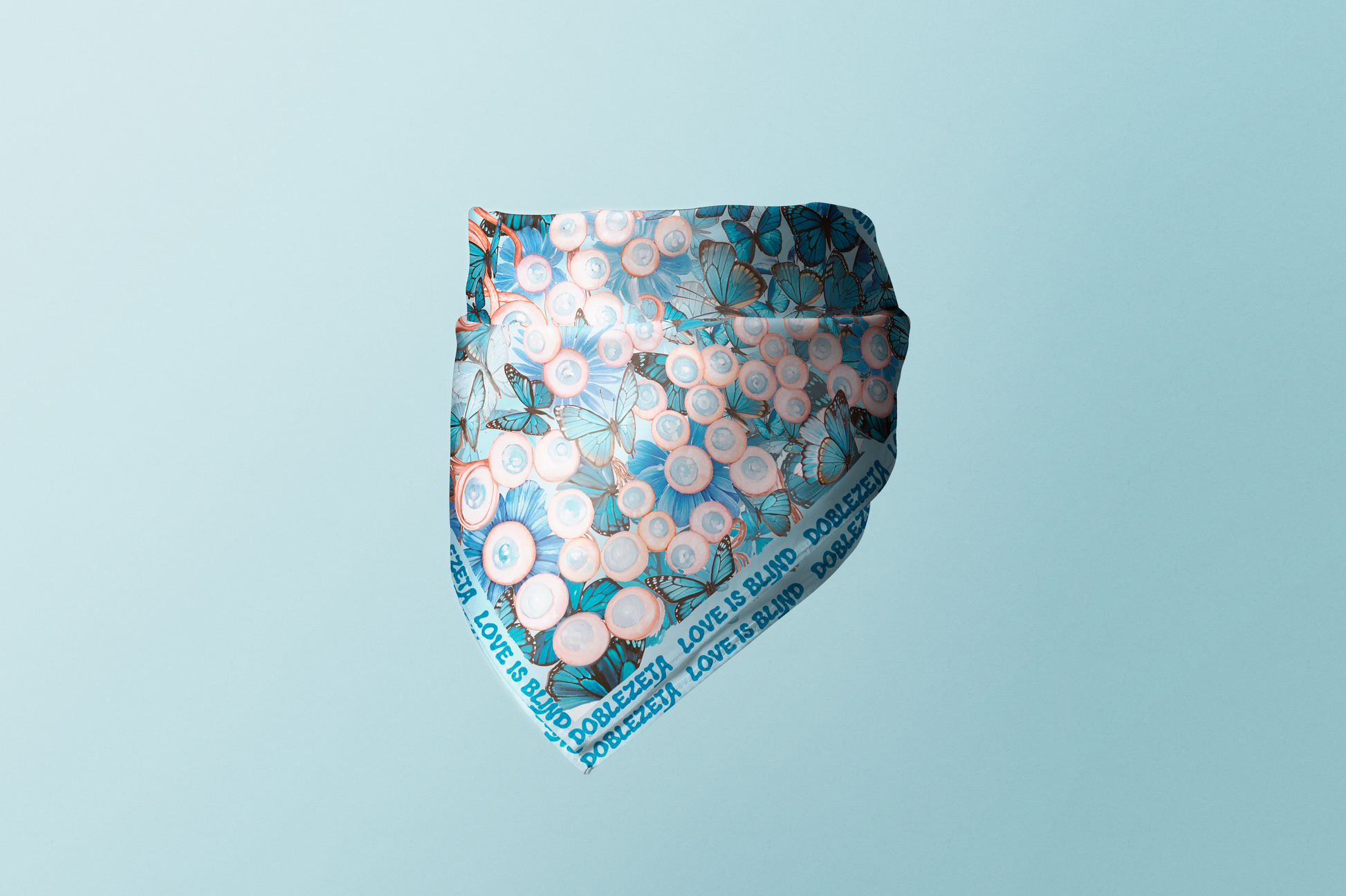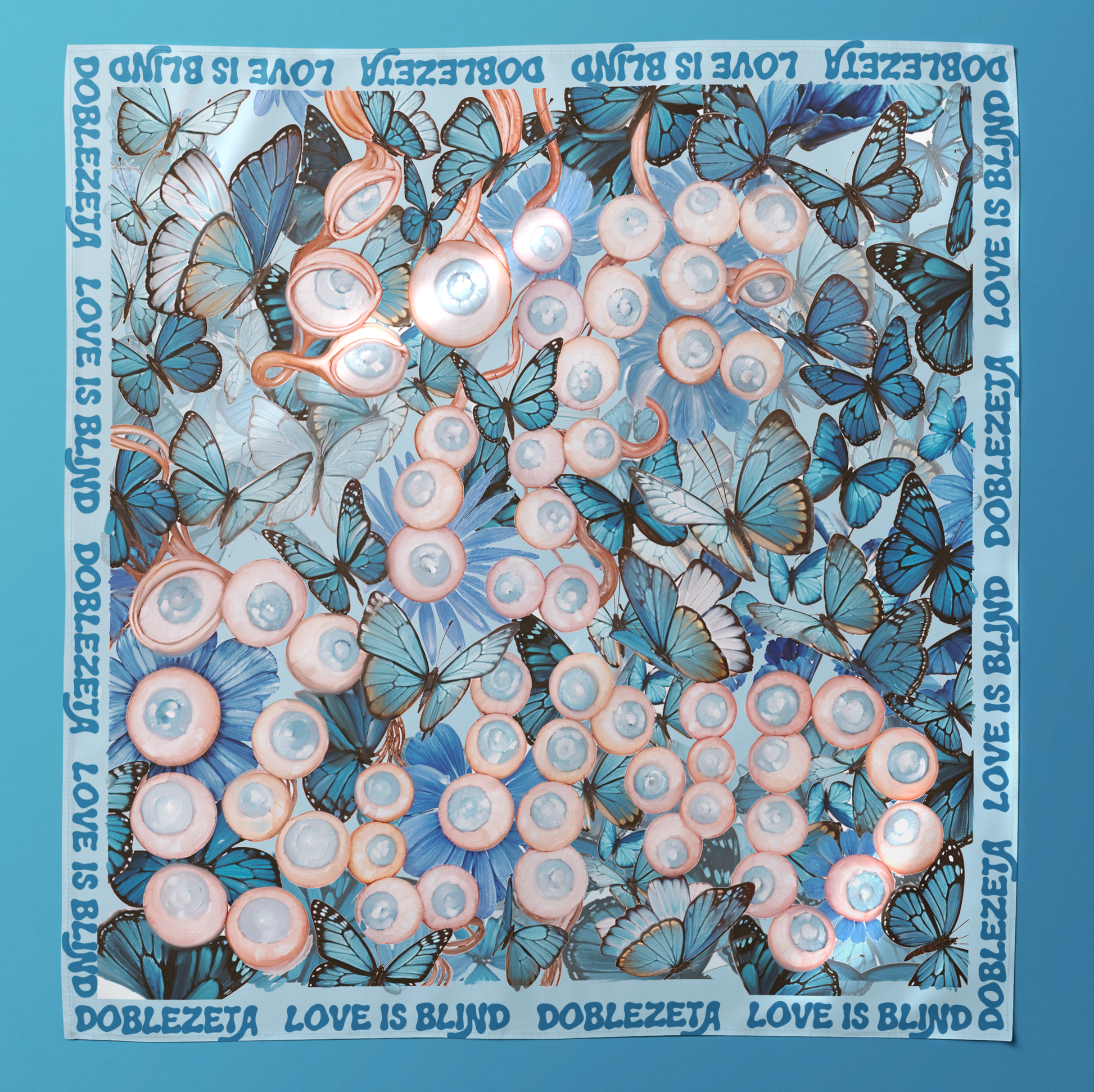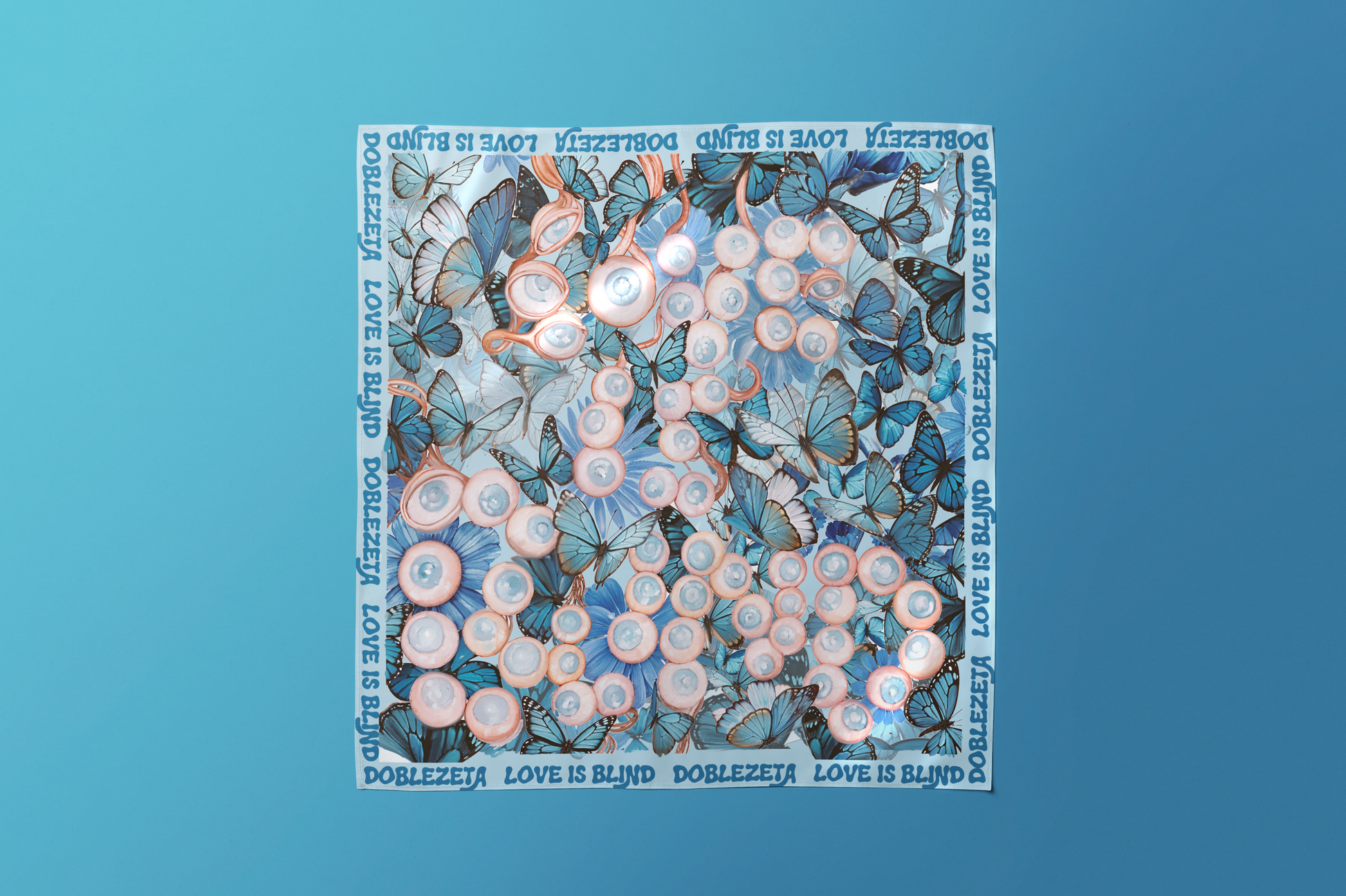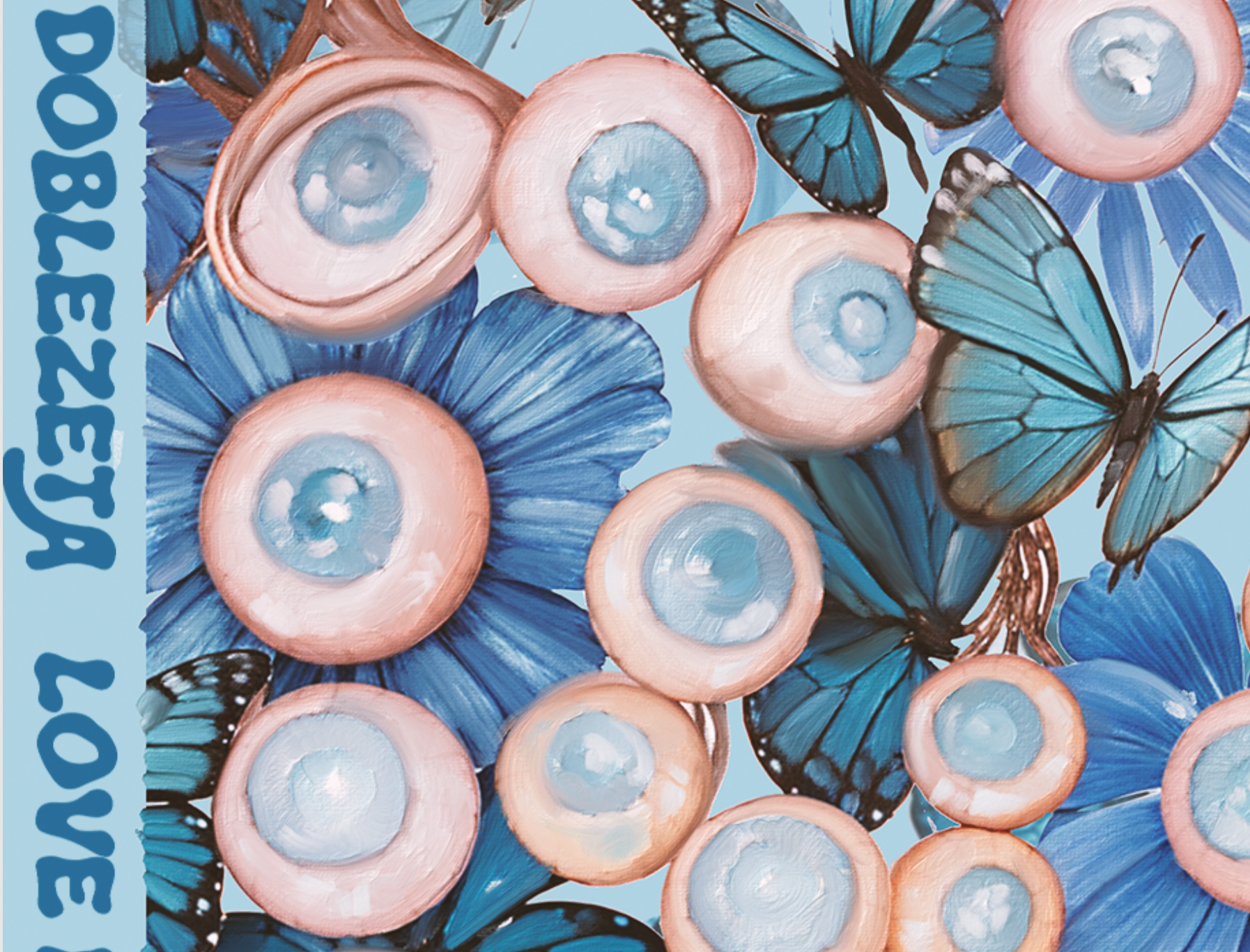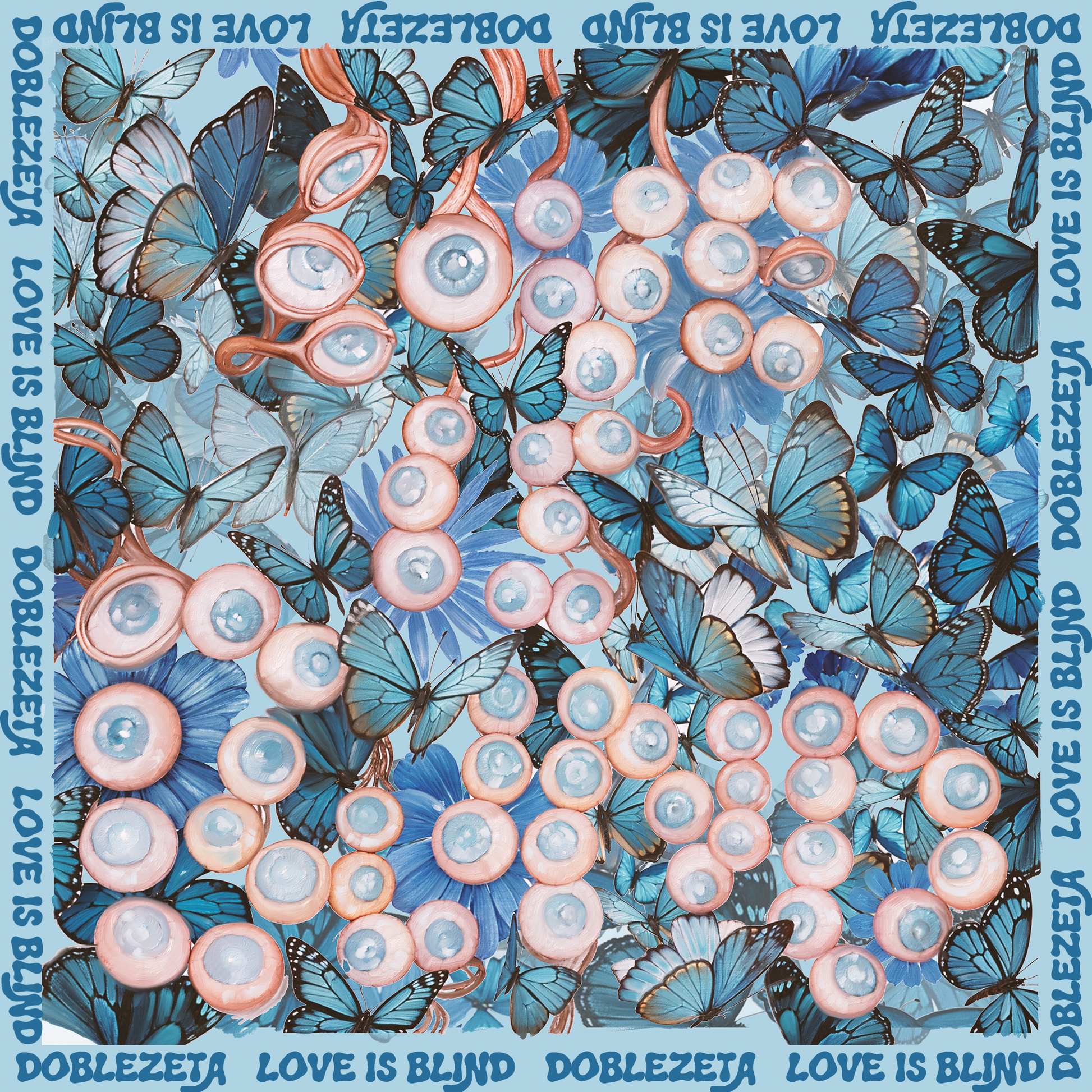 Pintura al óleo y técnica mixta, sobre un fondo azul cubierto de mariposas, una serie de ojos y globos oculares ciegos forman desdibujada la expresión "Love is blind", en castellano "el amor es ciego".