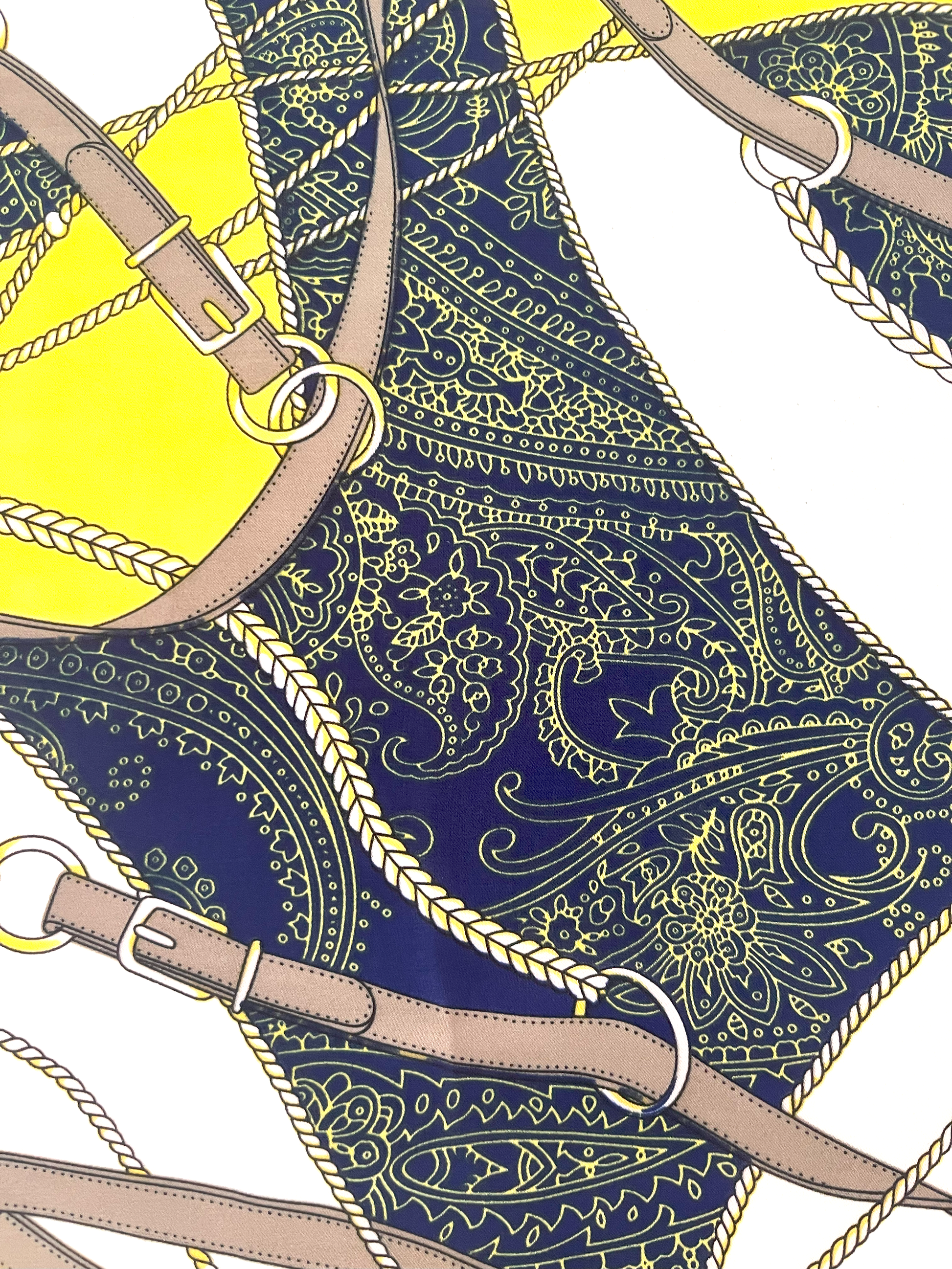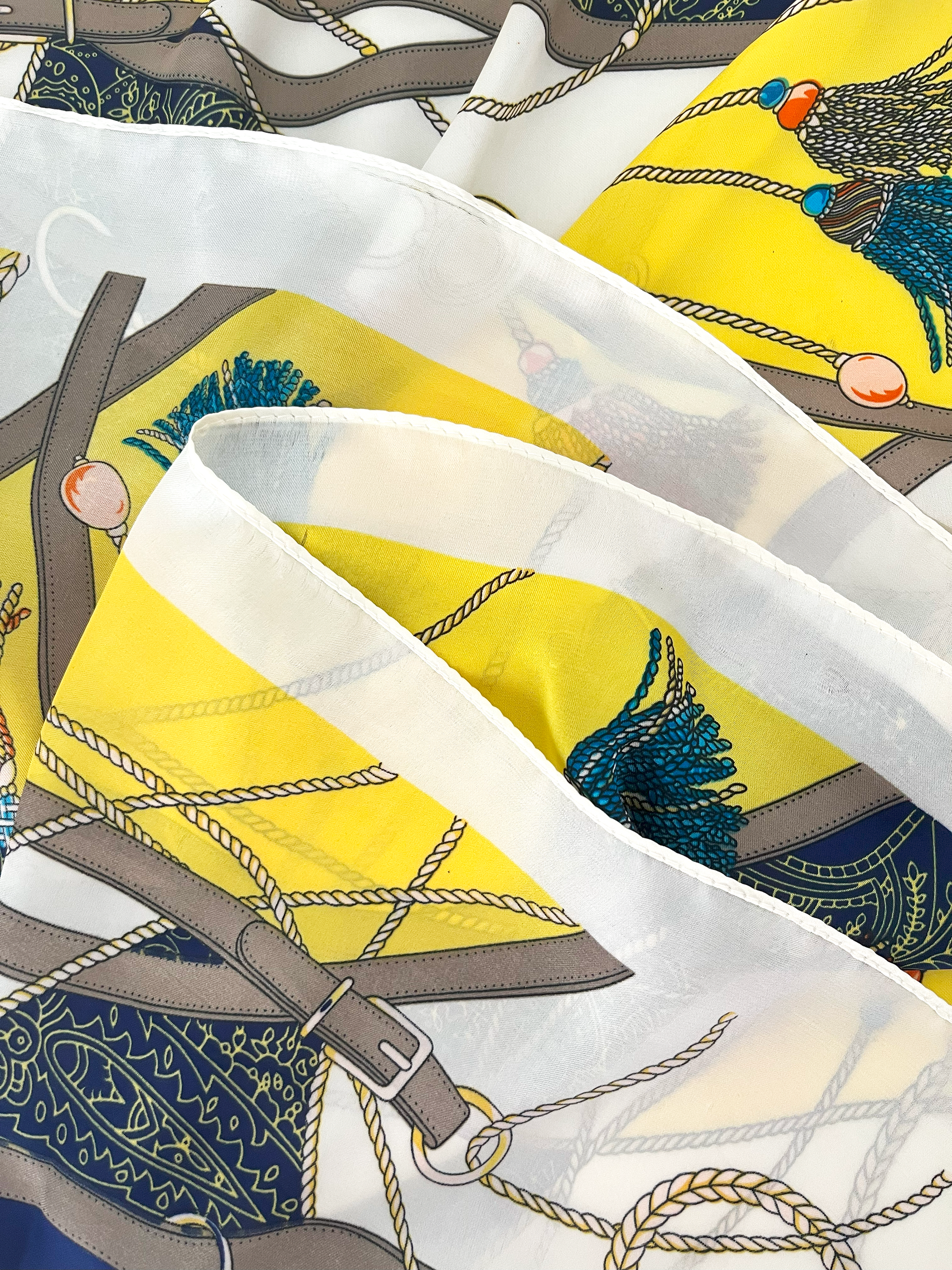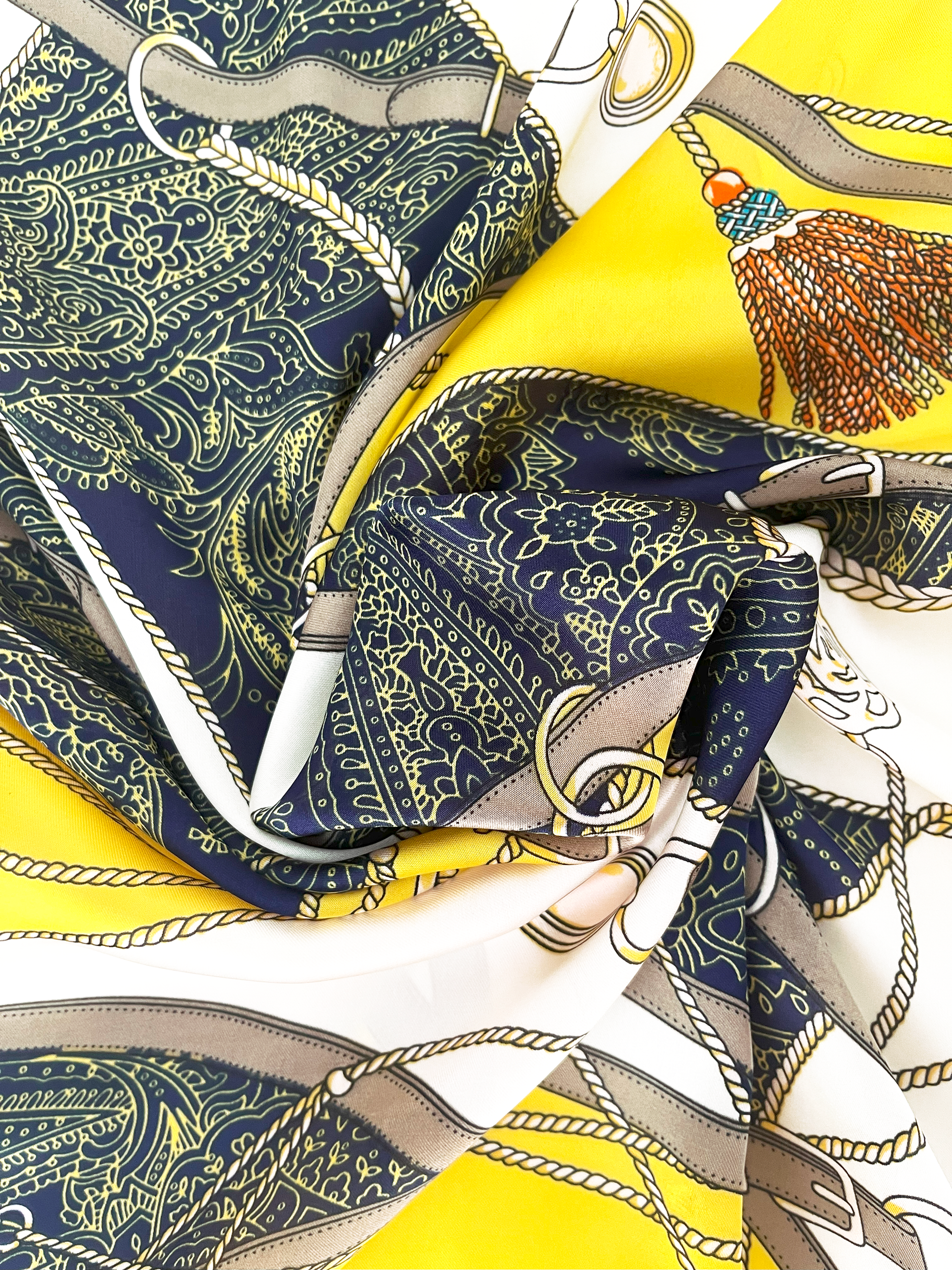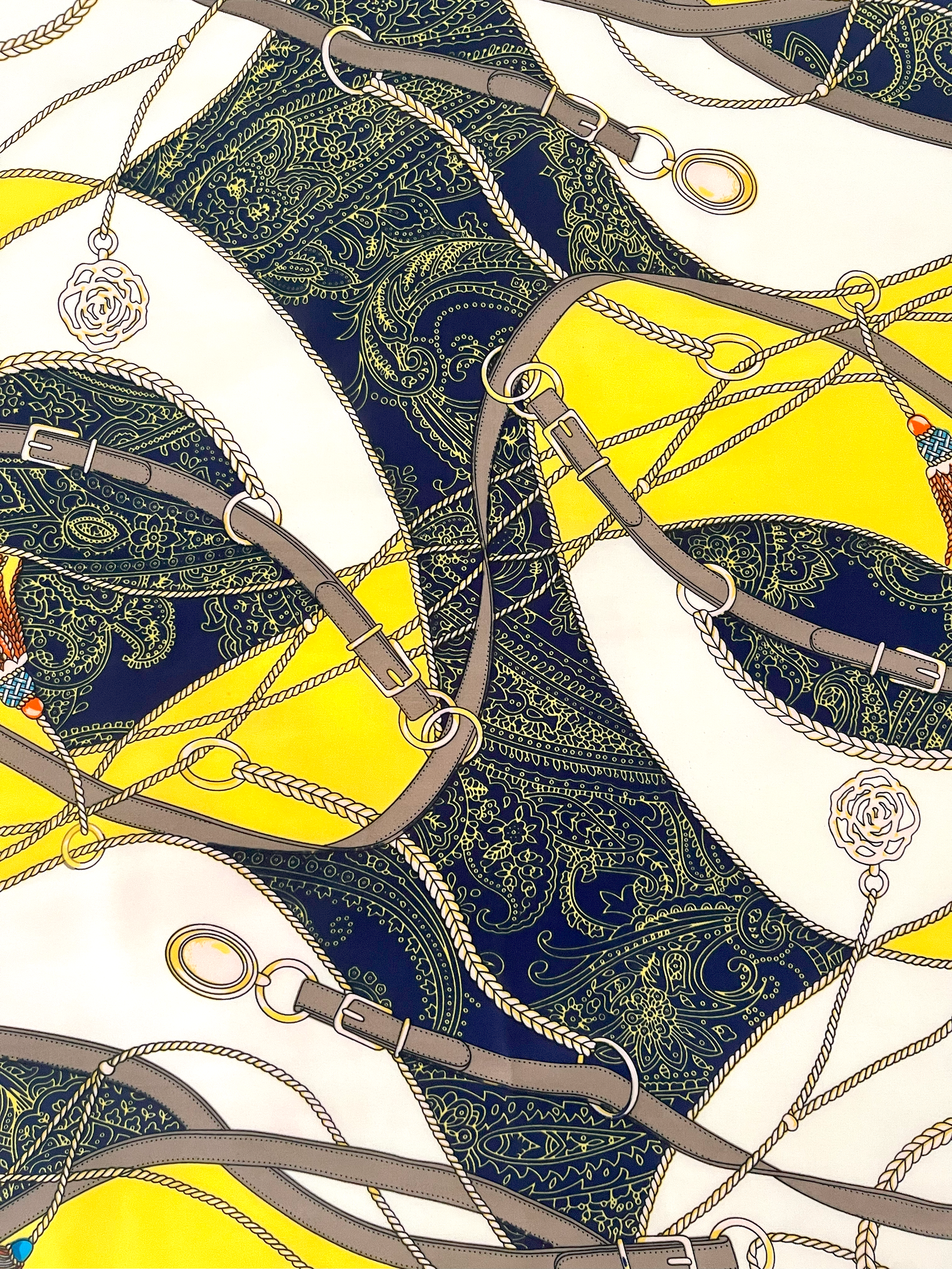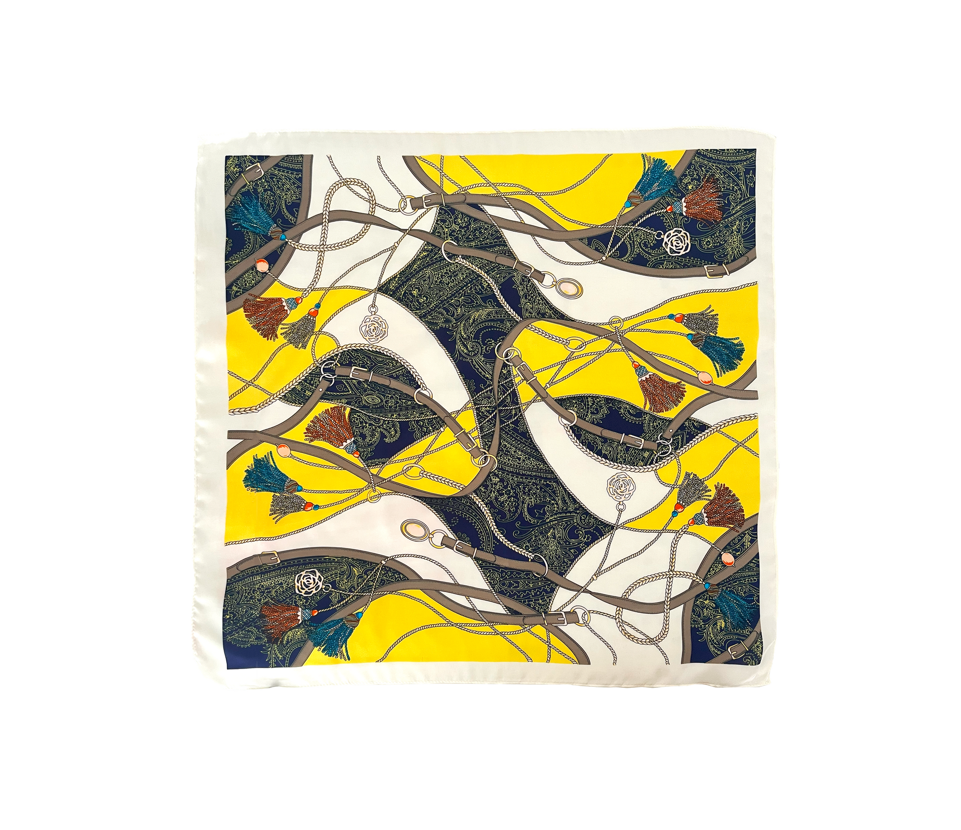 Pañuelo Único de Satén de Poliester con diseño de hebillas y borlas en tonos azul marino, amarillo, marrón, blanco y detalles en turquesa y rojo teja.
