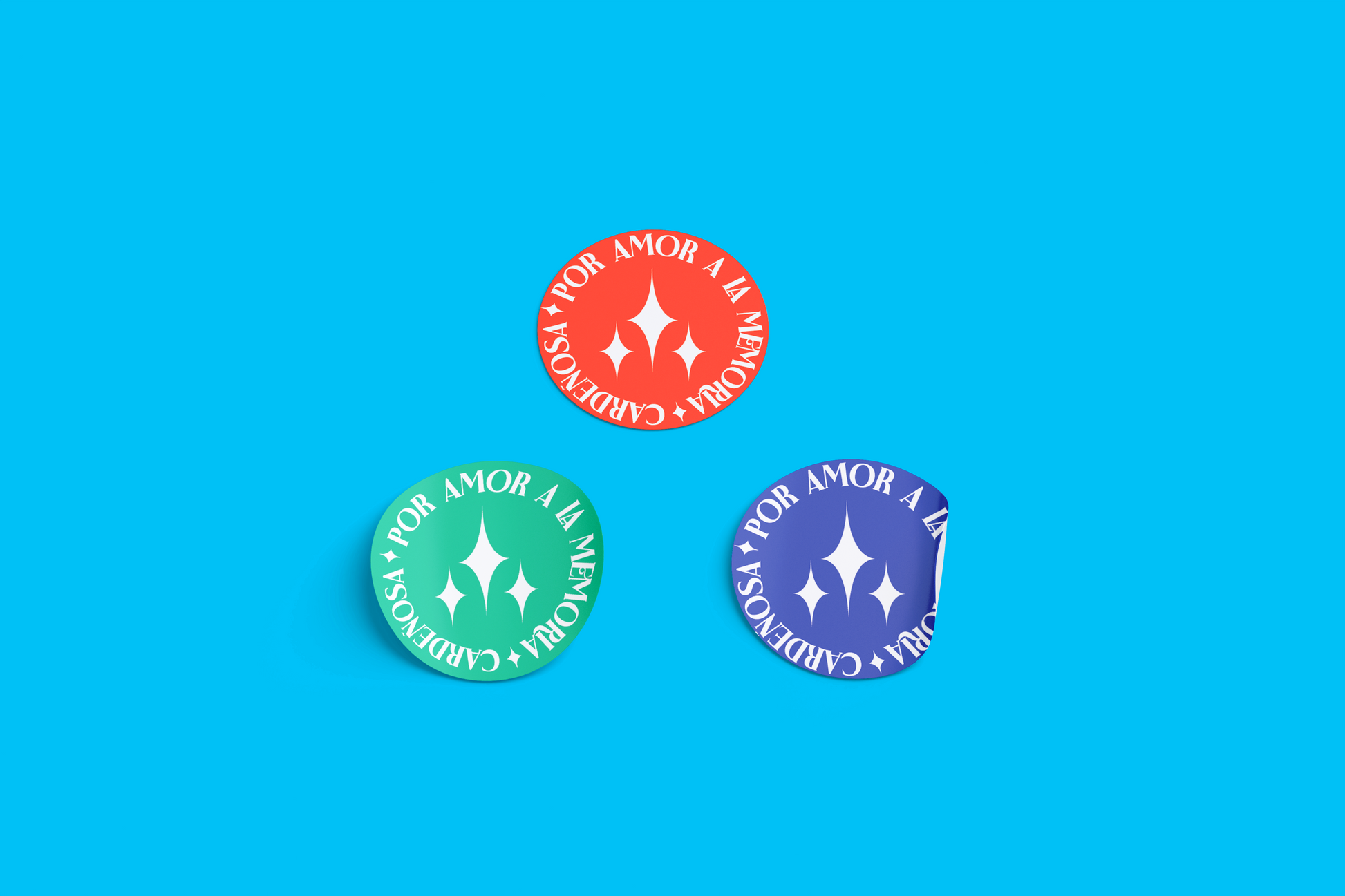 Pegatina circular "Por Amor a la Memoria" con las tres estrellas representativas del logo, en honor al monumento de las tres cruces.