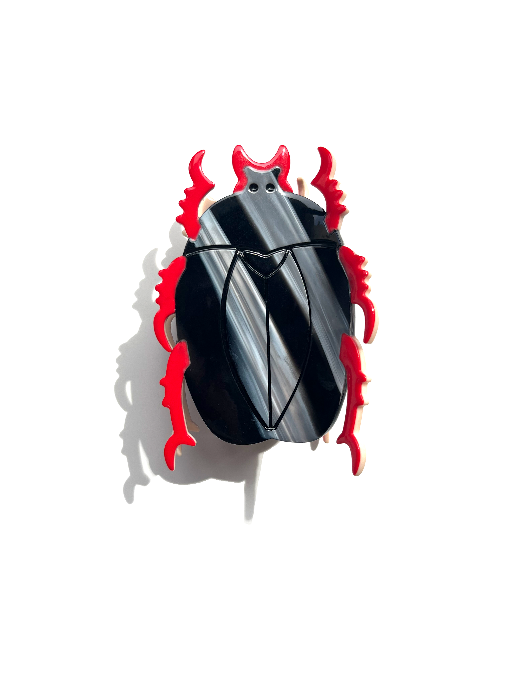 Pinza de acetato para el pelo, con forma de escarabajo, colores negro, rojo y blanco.