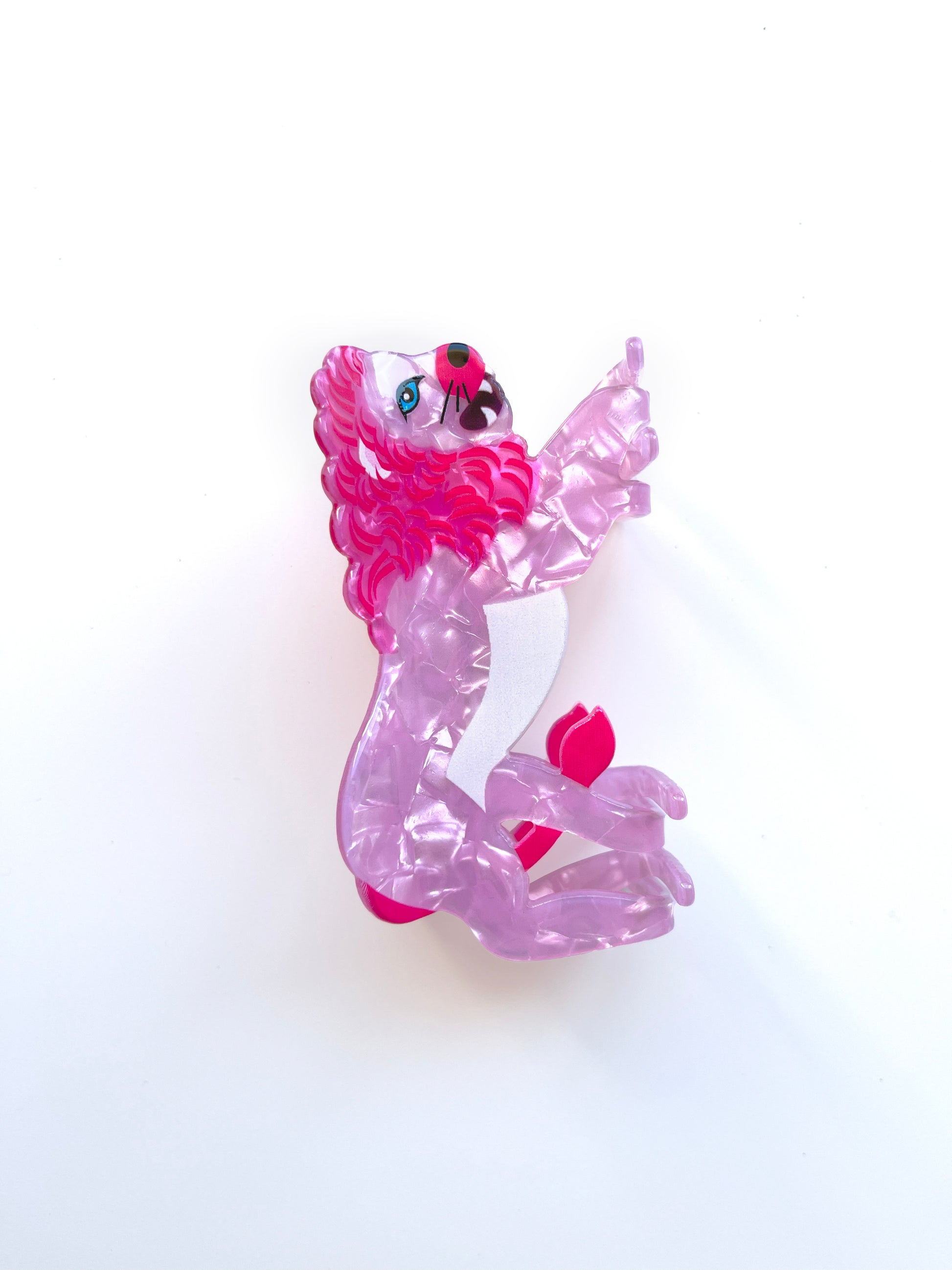 Pinza de acetato para el pelo, con forma de león en tonos rosas irisados y fucsia.