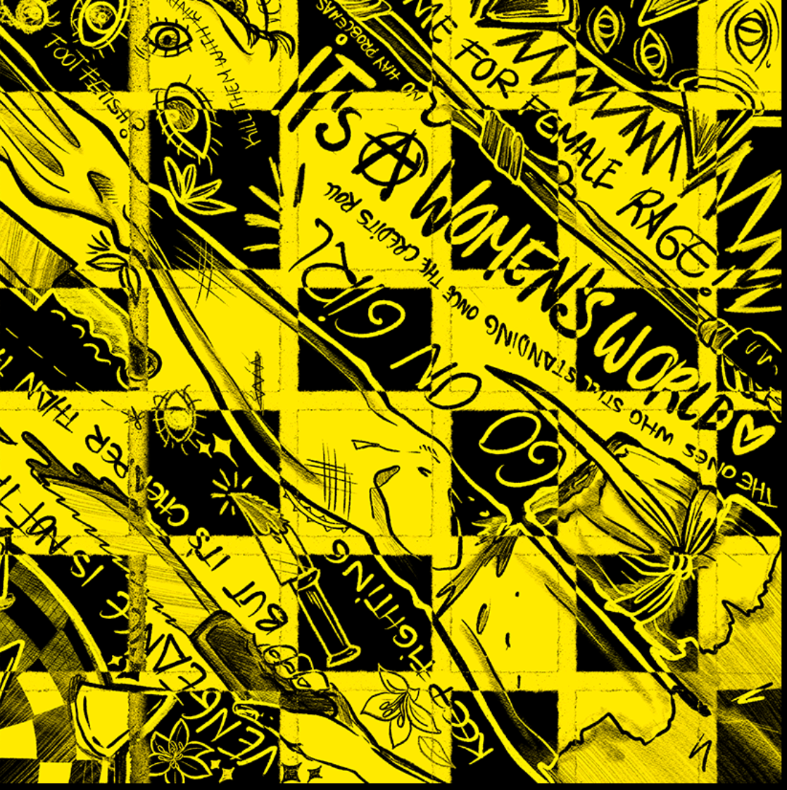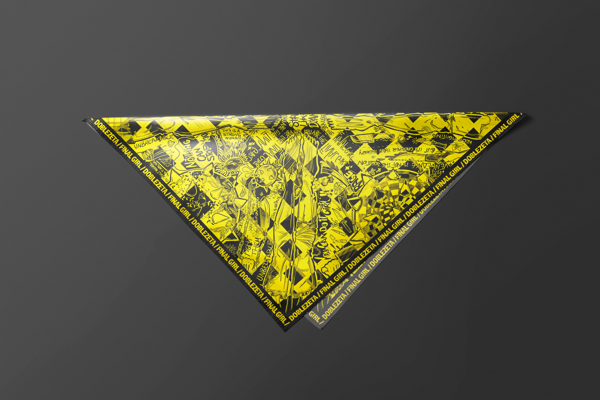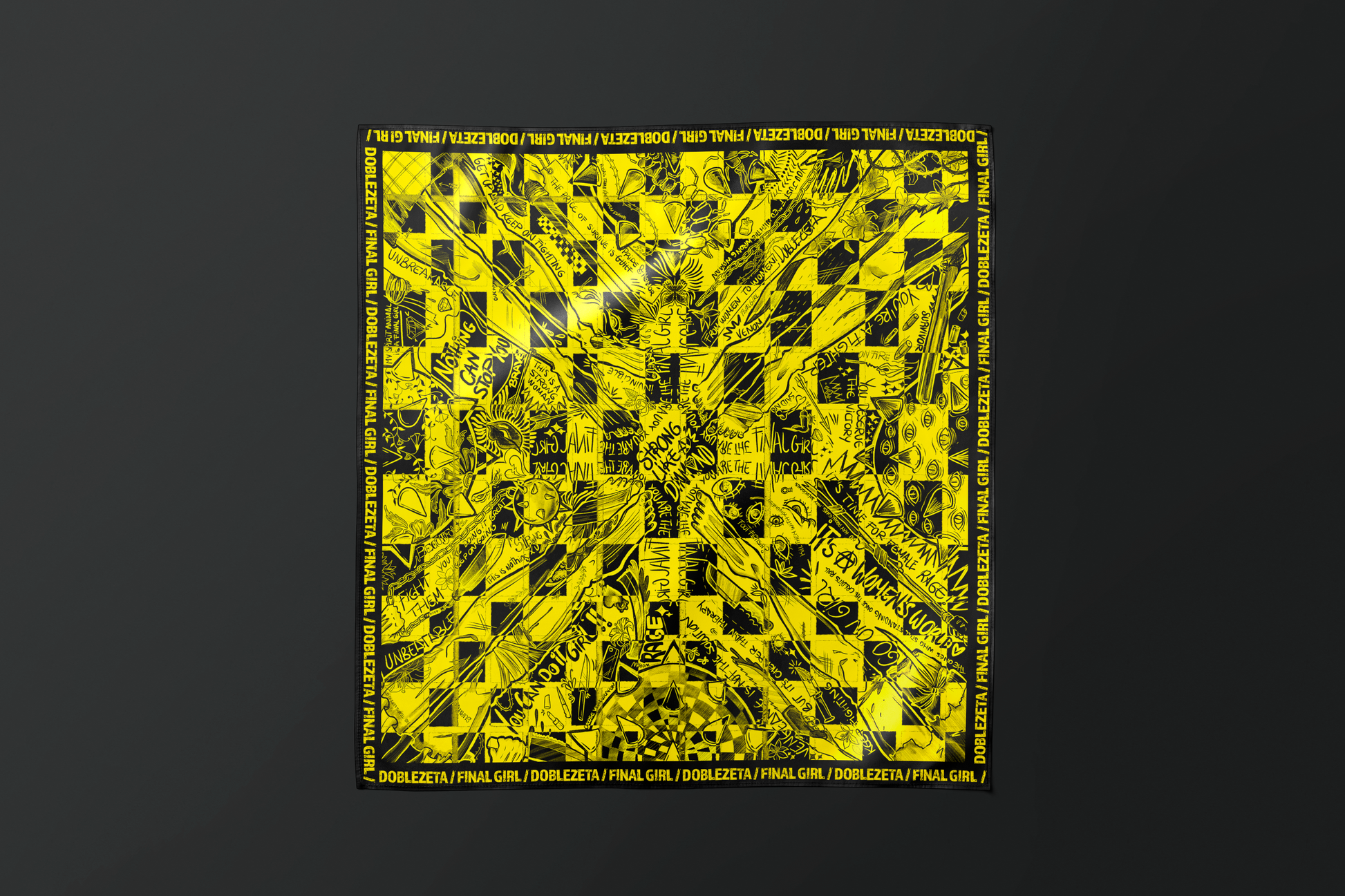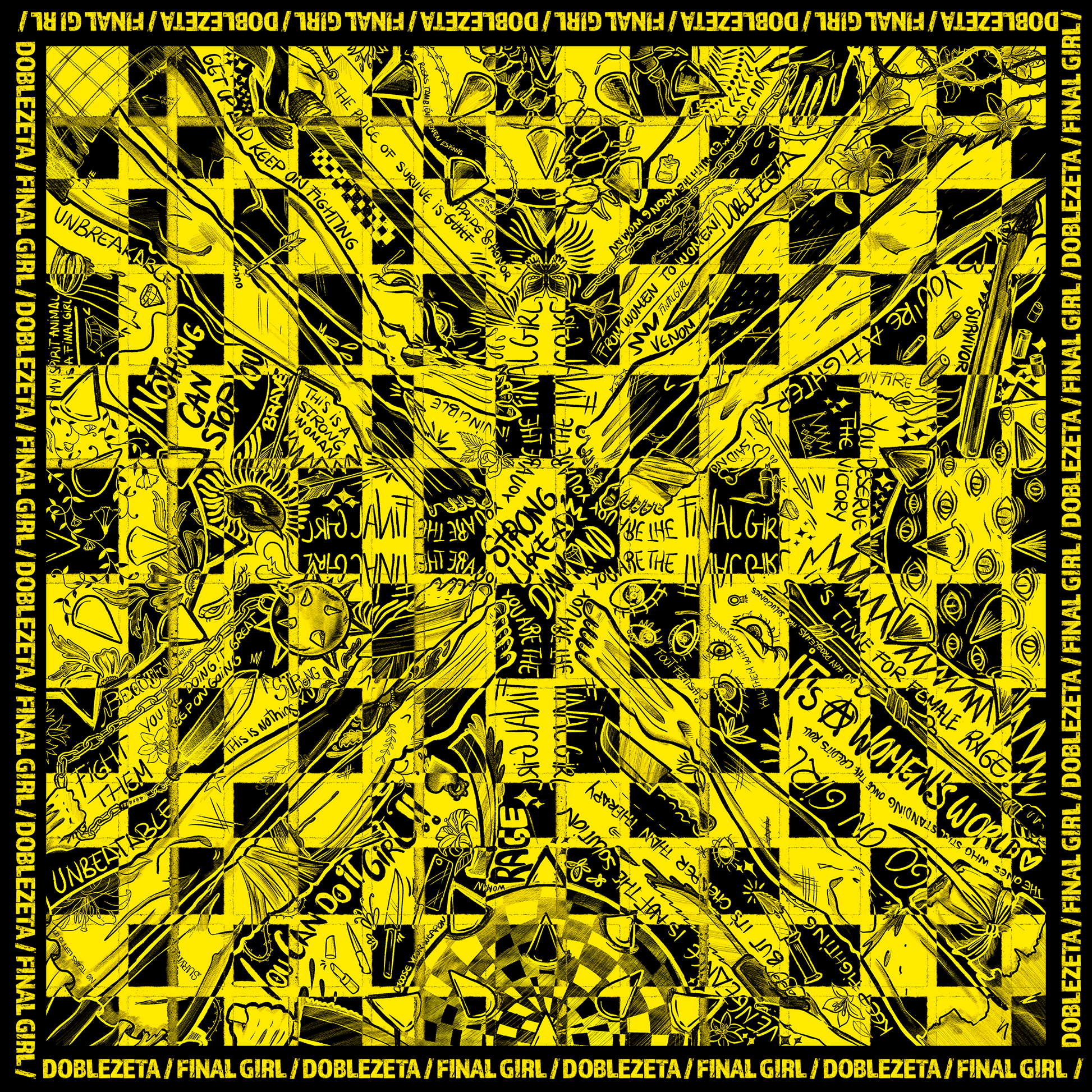 Diseño punk en amarillo y negro con fondo damero, inspirado en el concepto "FInal Girl" de las películas, rico en detalle, haciendo múltiples referencias al cine de terror y con mensajes de empoderamiento y fuerza.